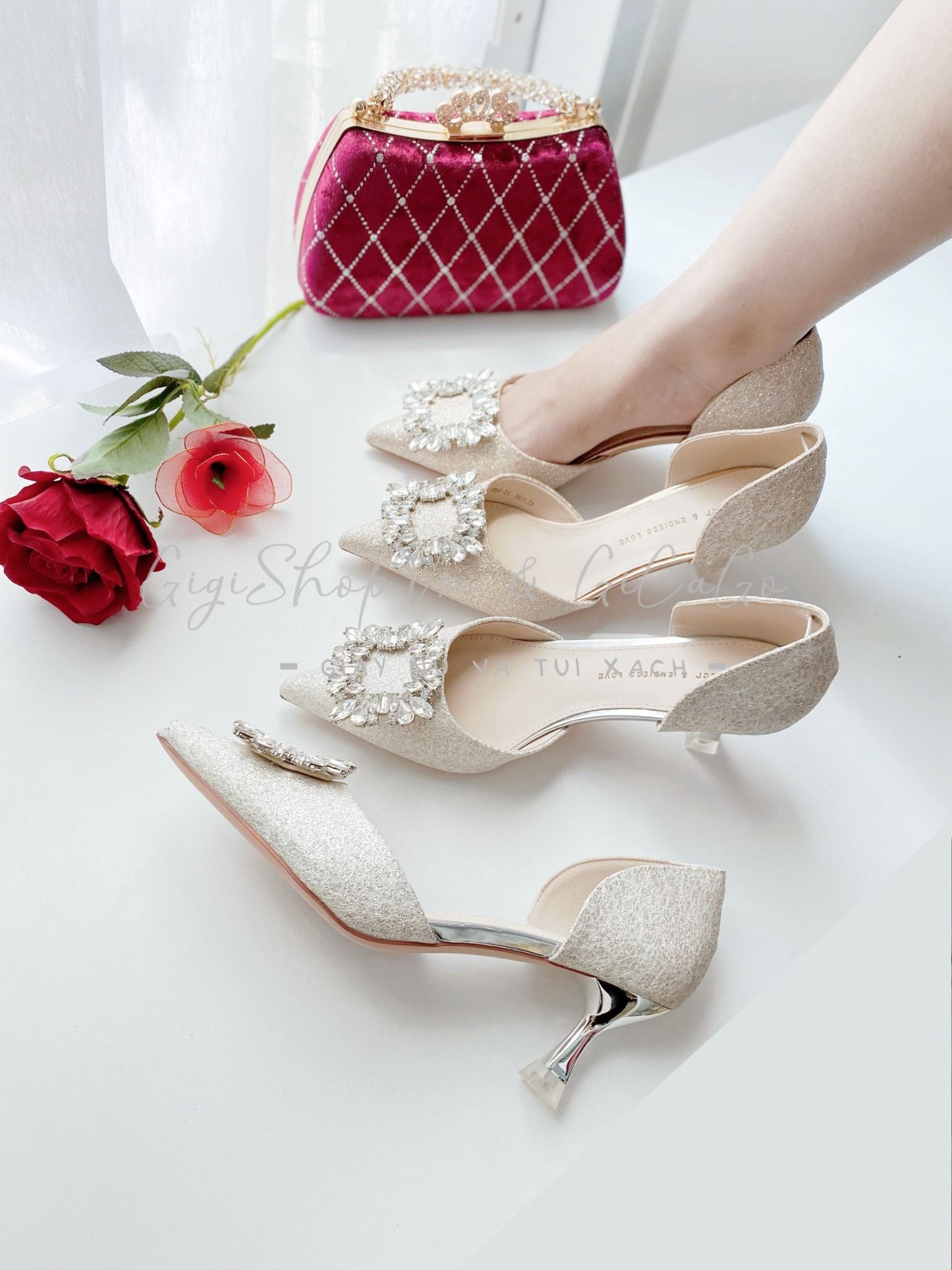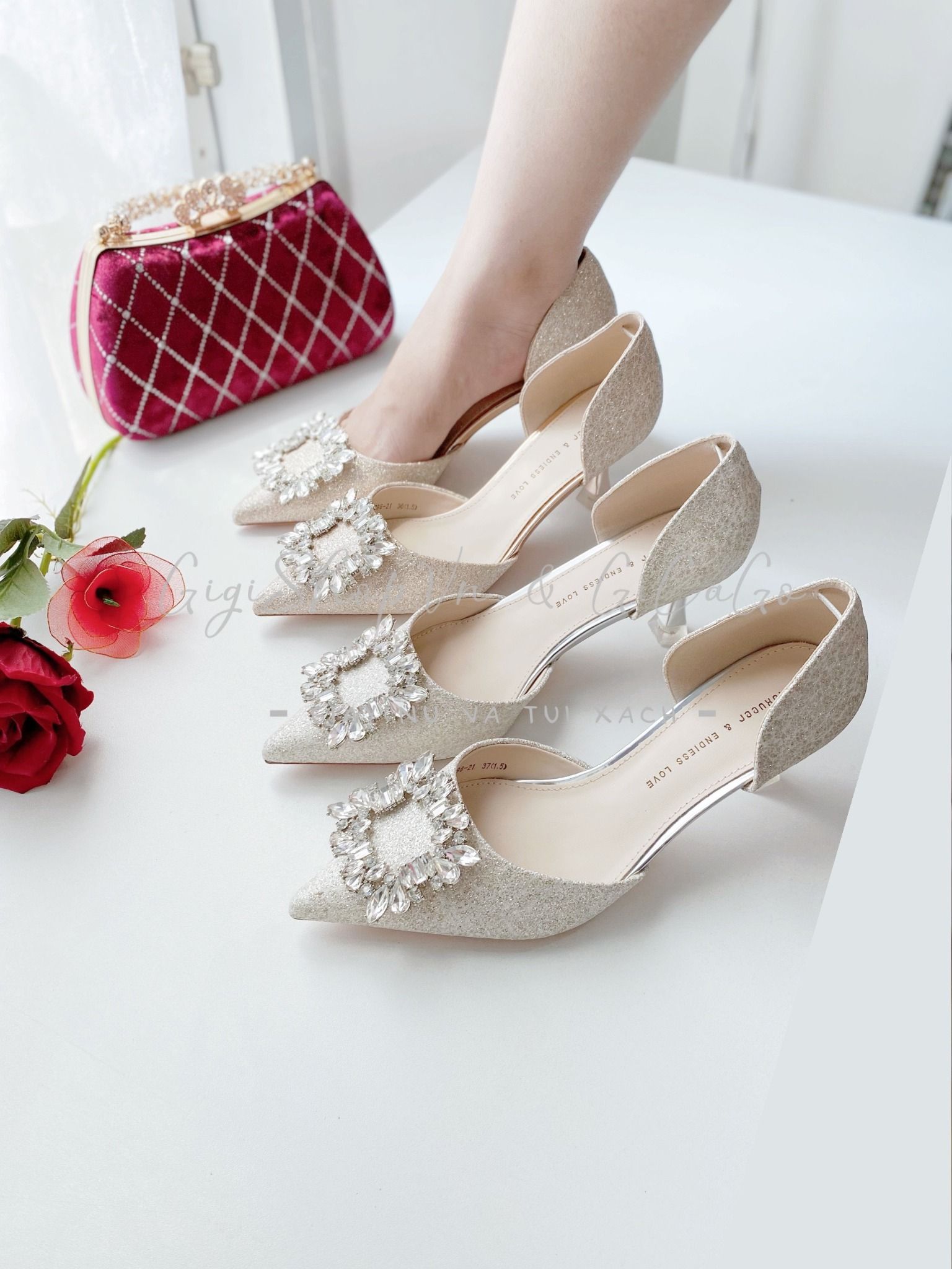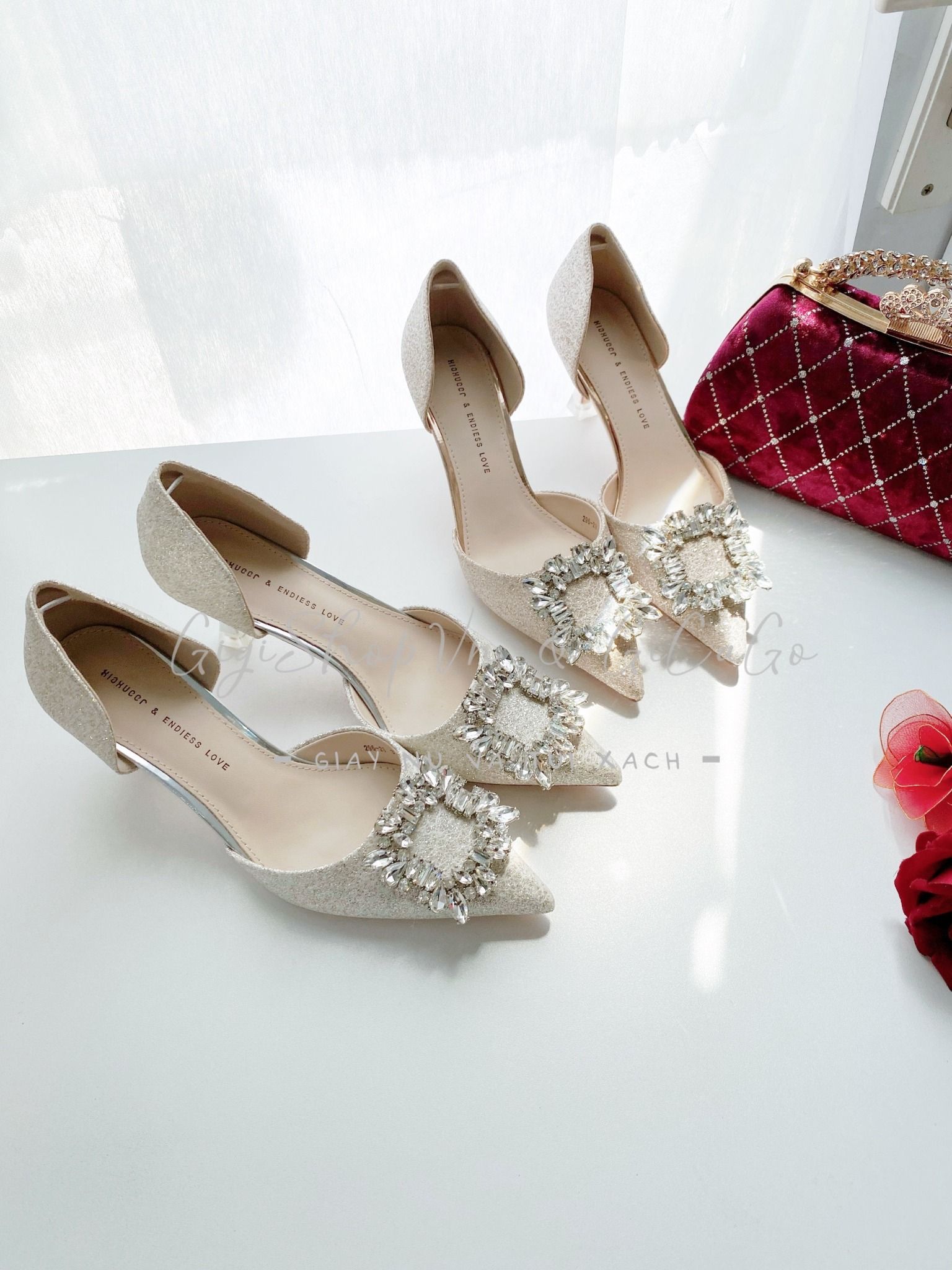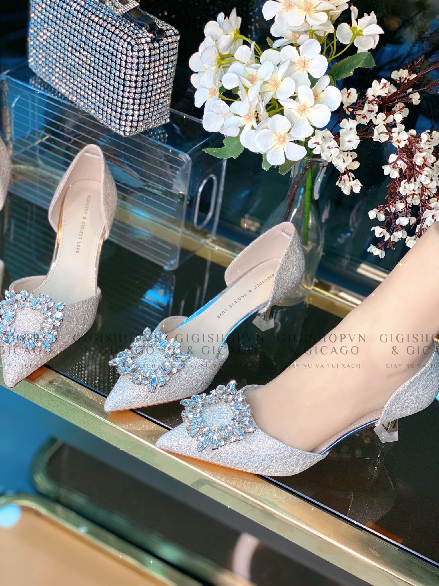 Cao gót nhọn hở eo bling khoá đá tiệc C655