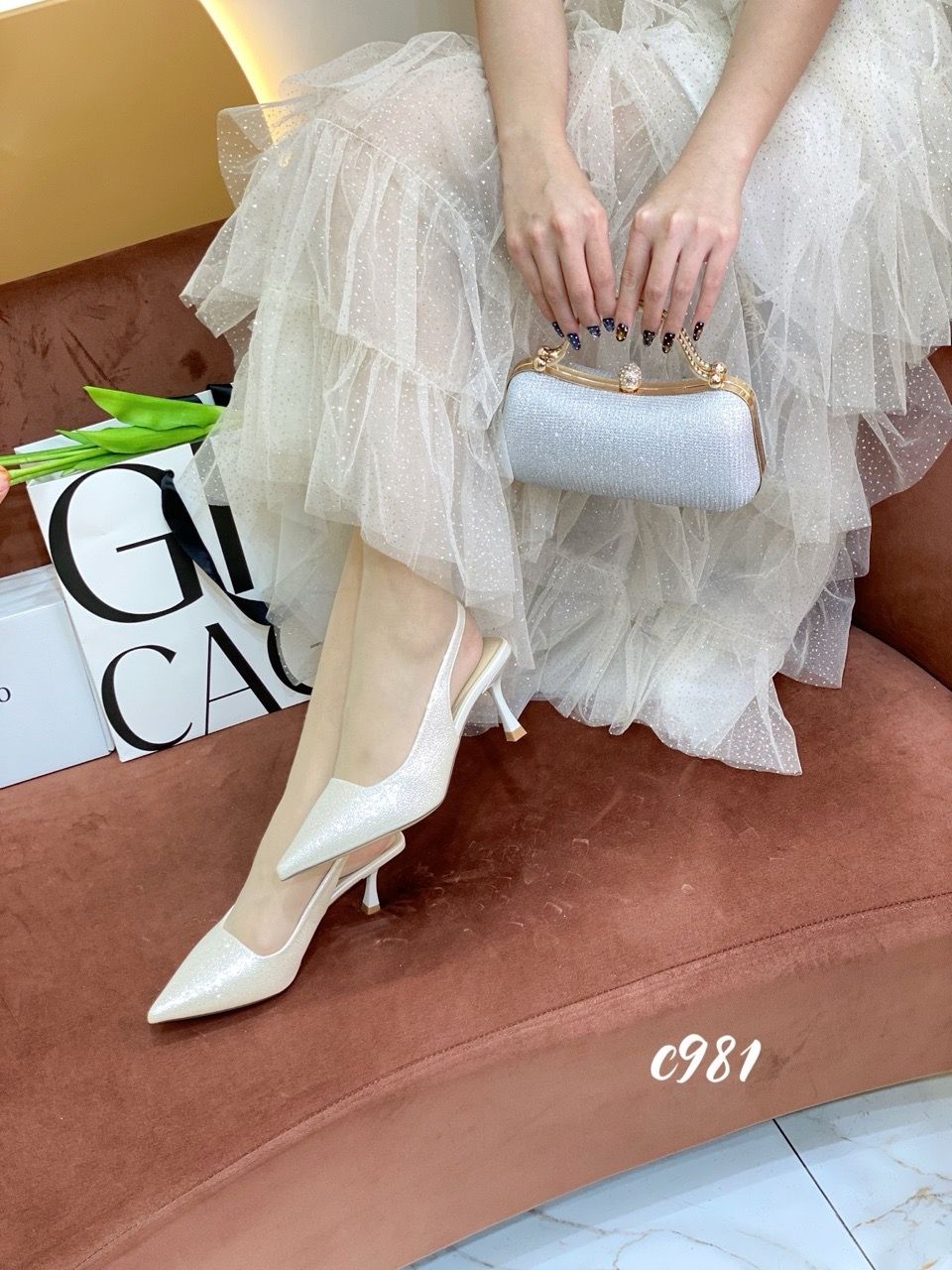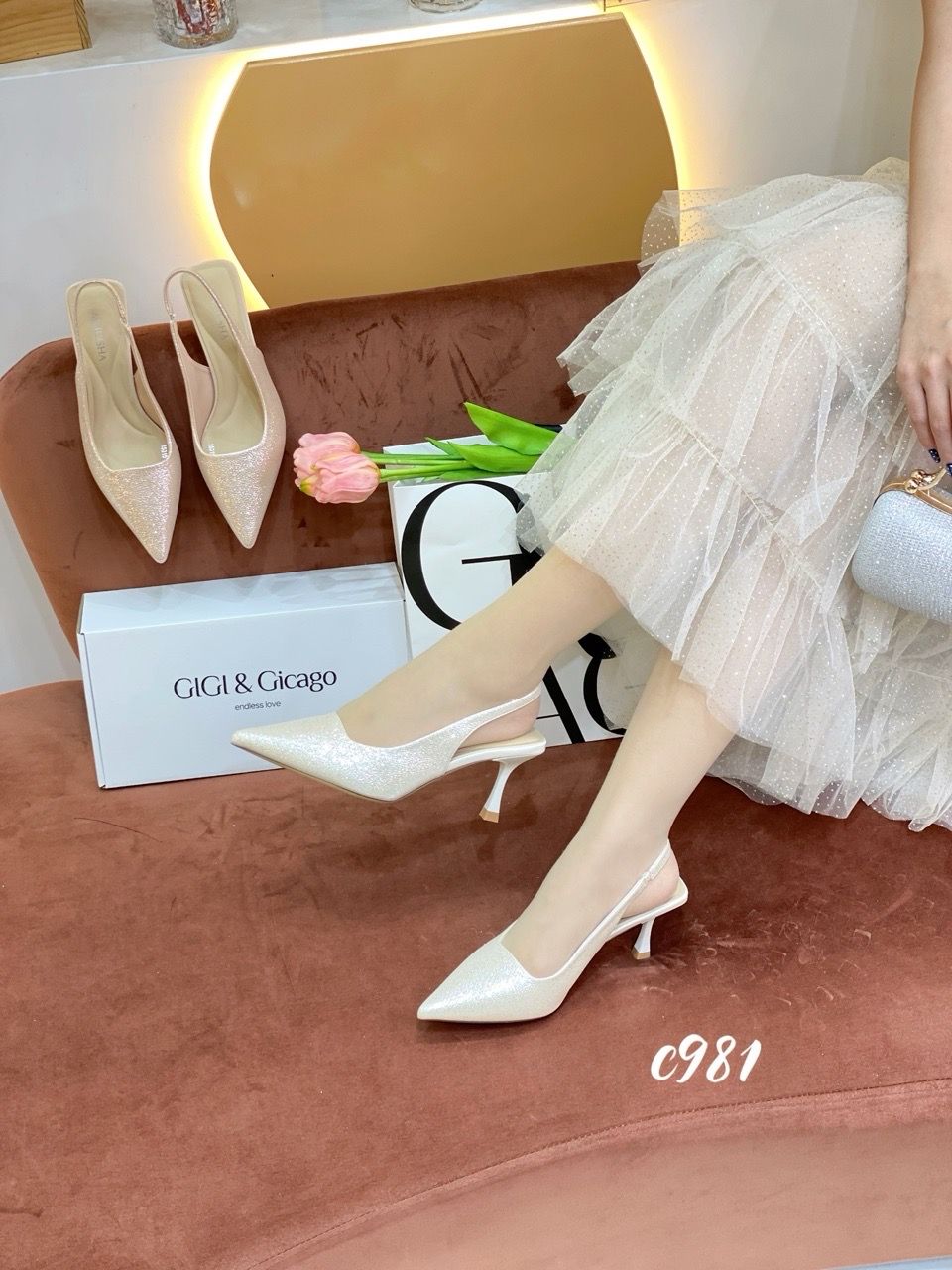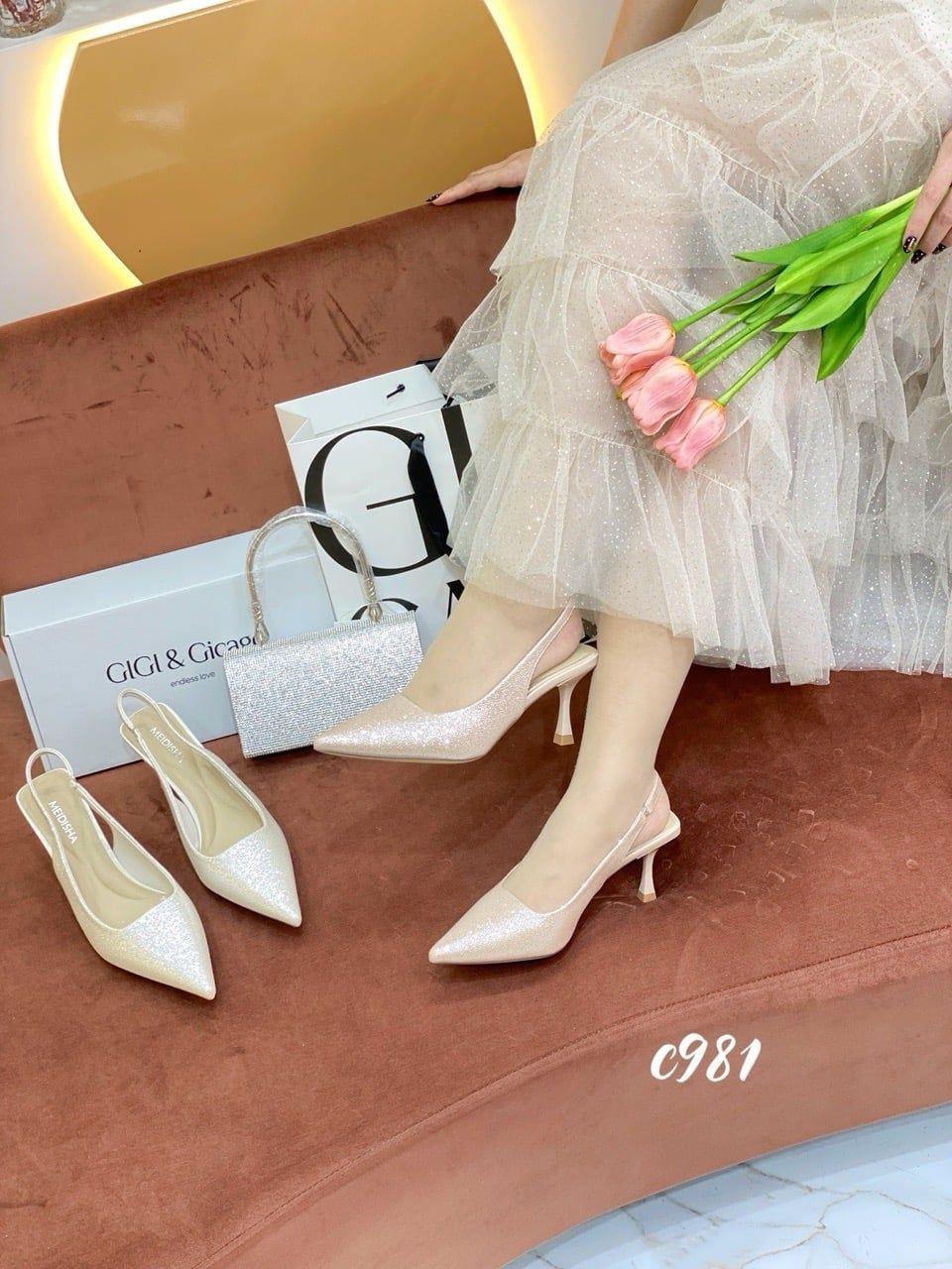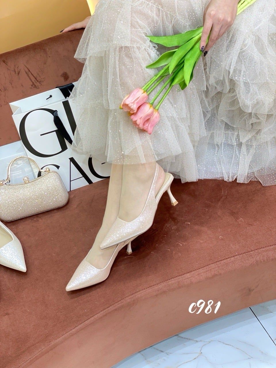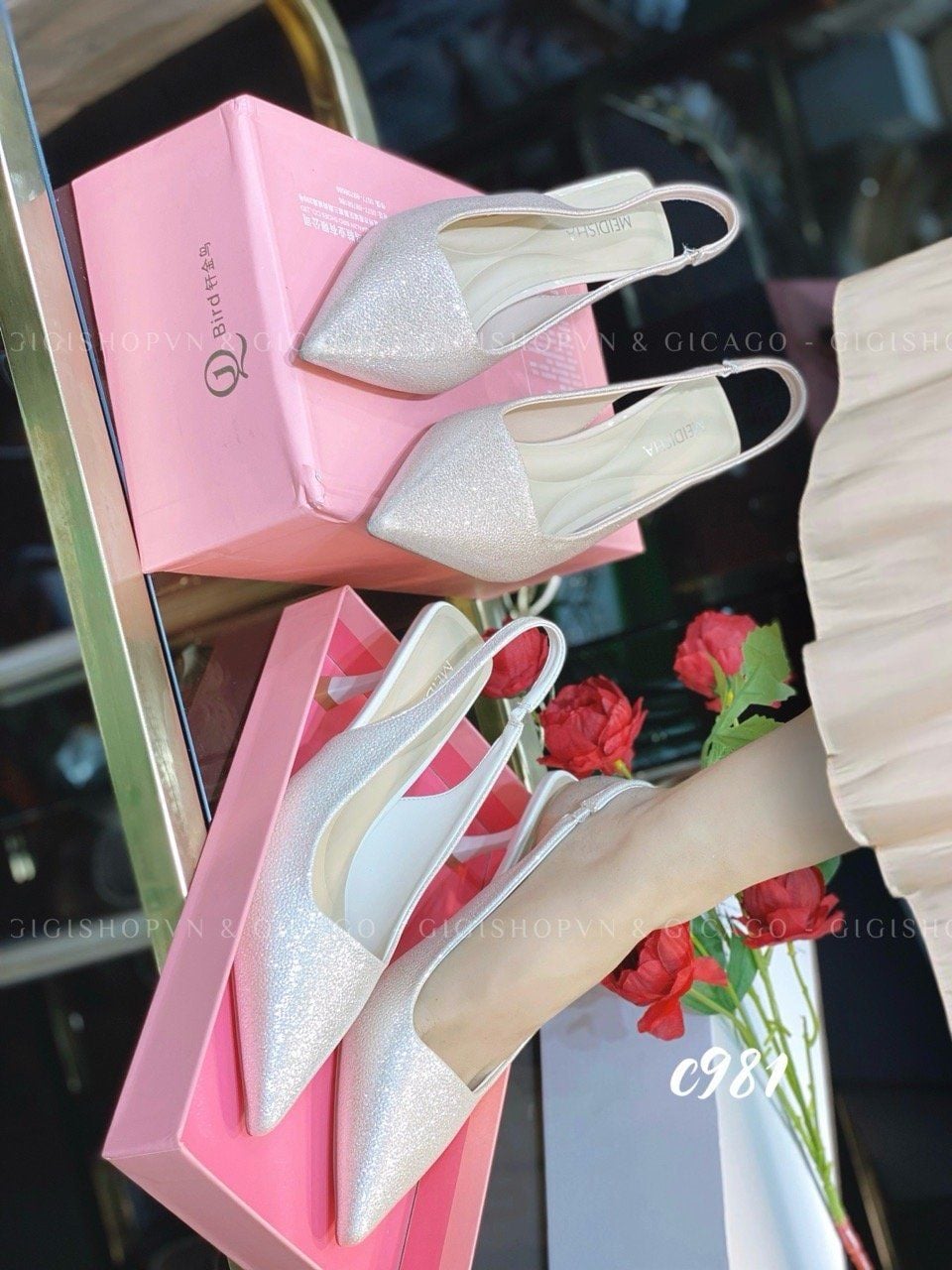 Cao gót nhọn hở gót bling C981