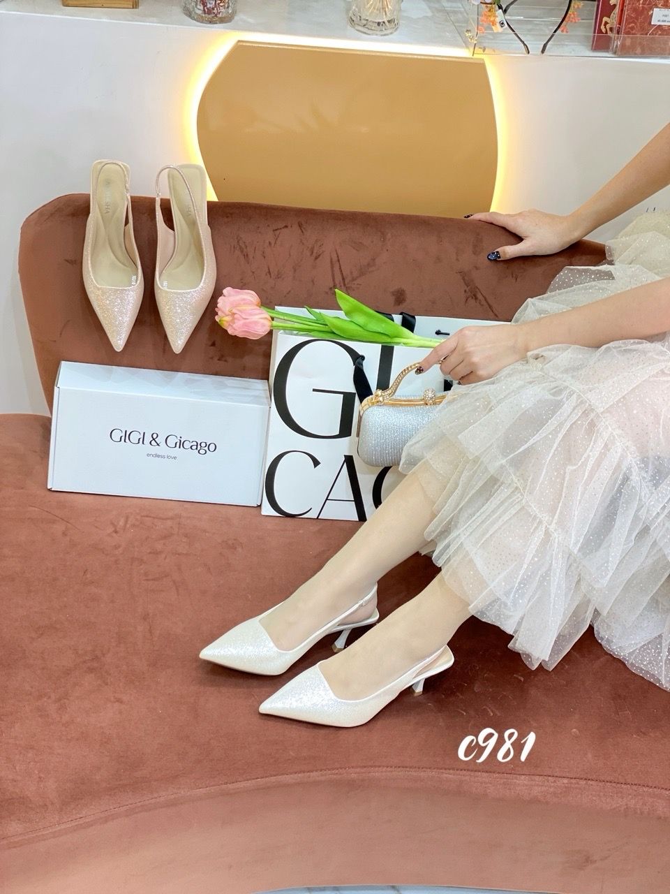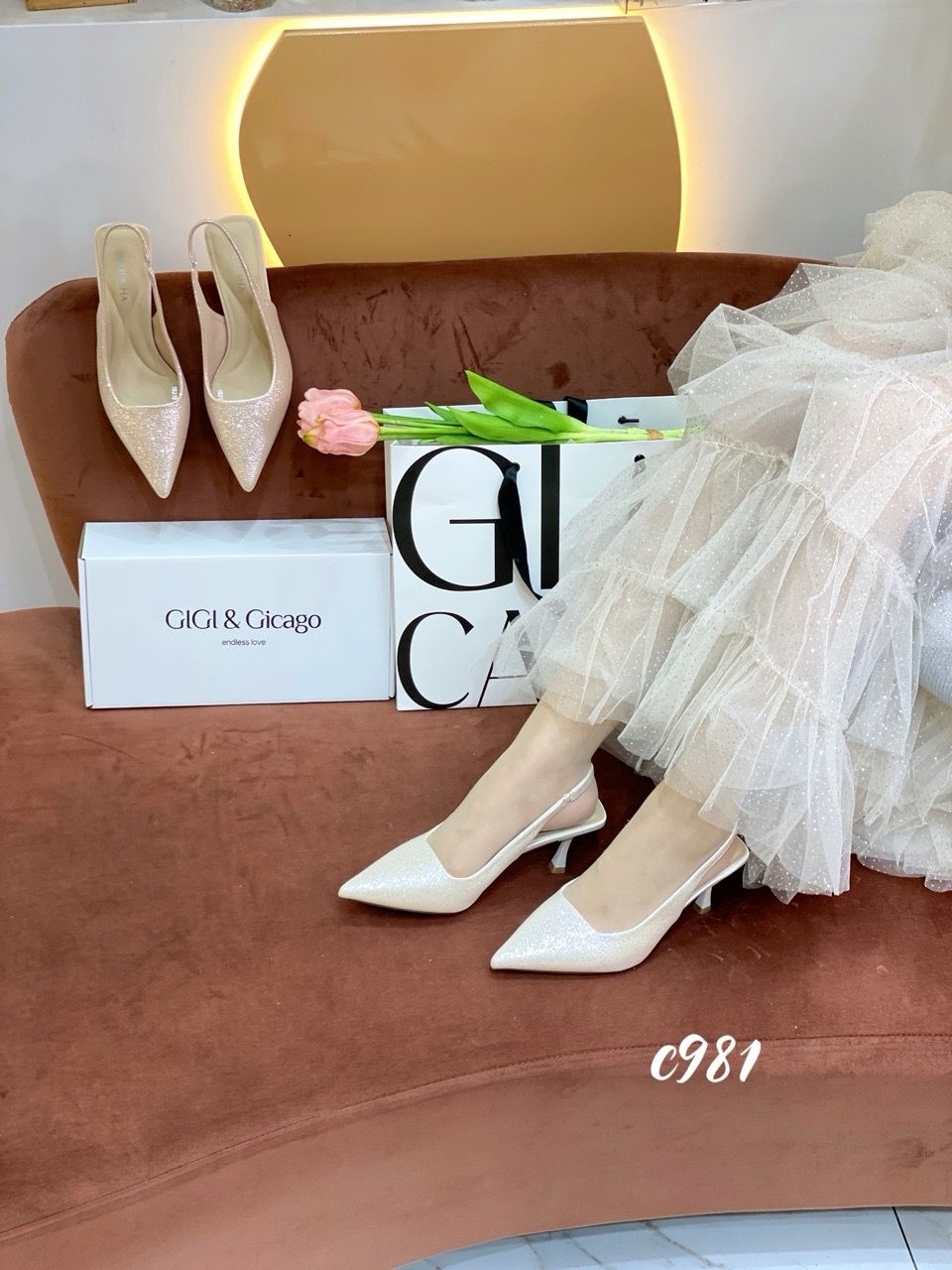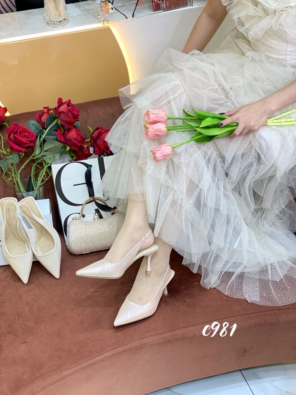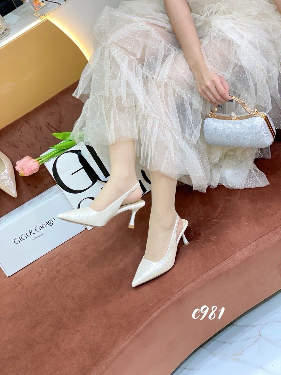 Cao gót nhọn hở gót bling C981