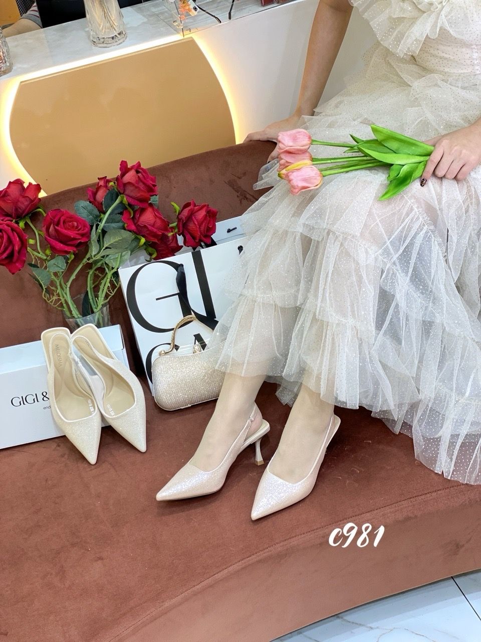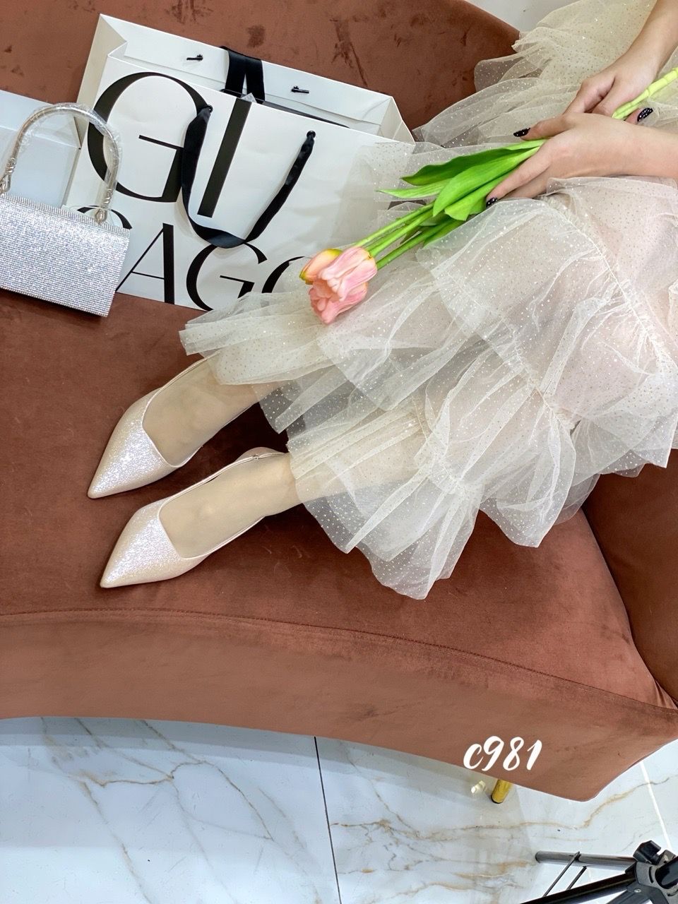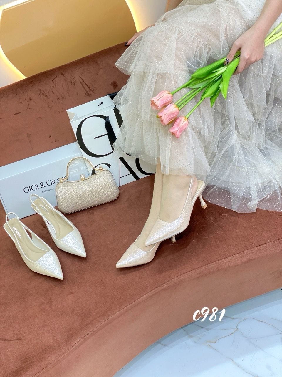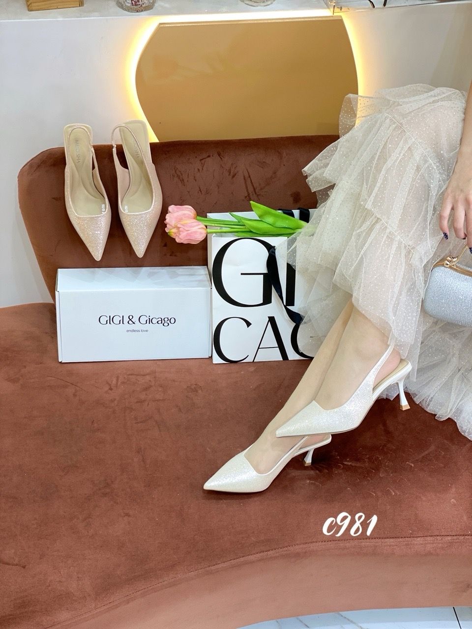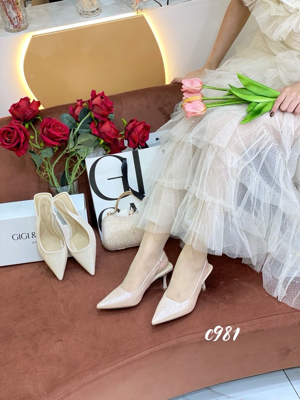 Cao gót nhọn hở gót bling C981