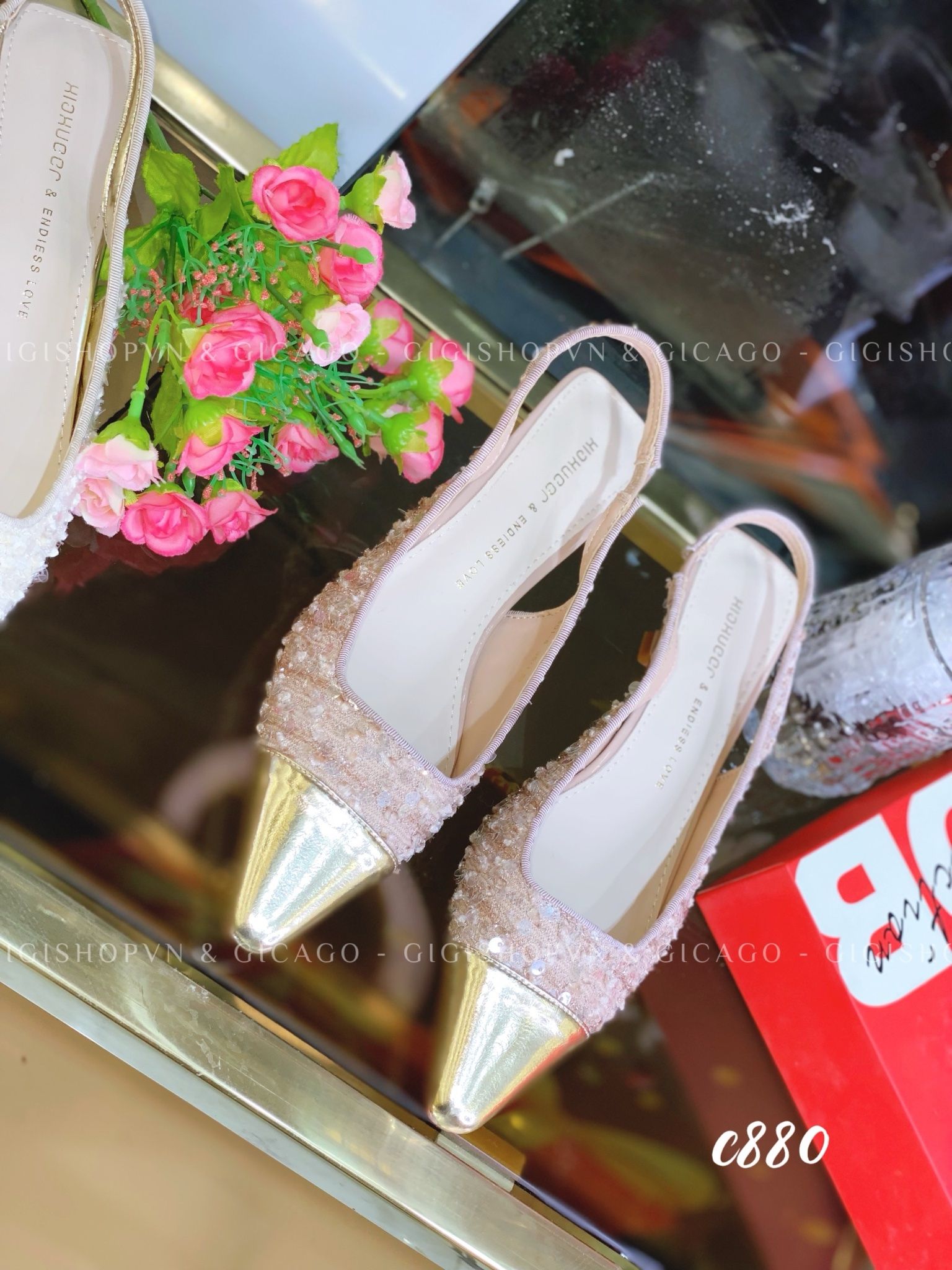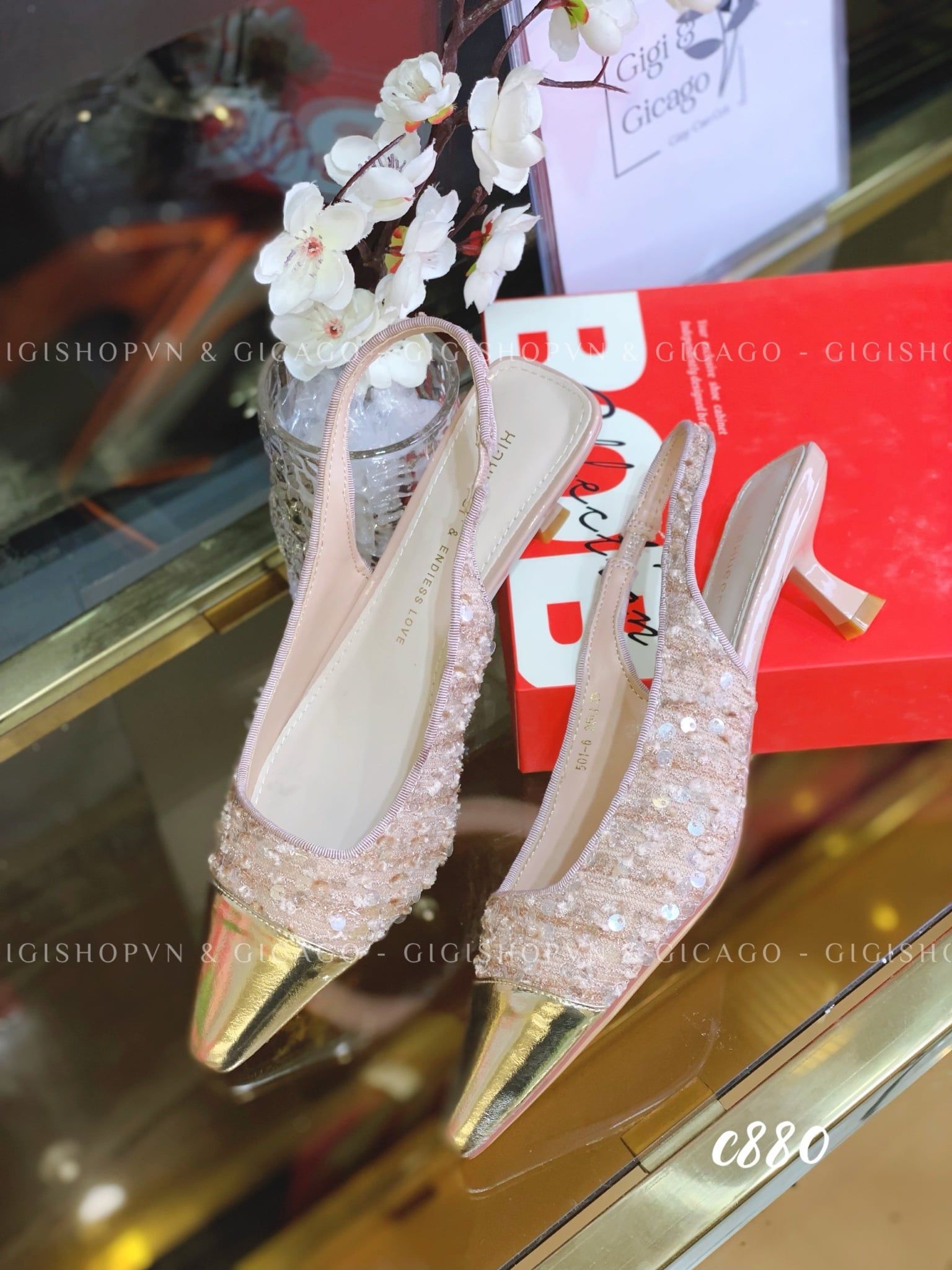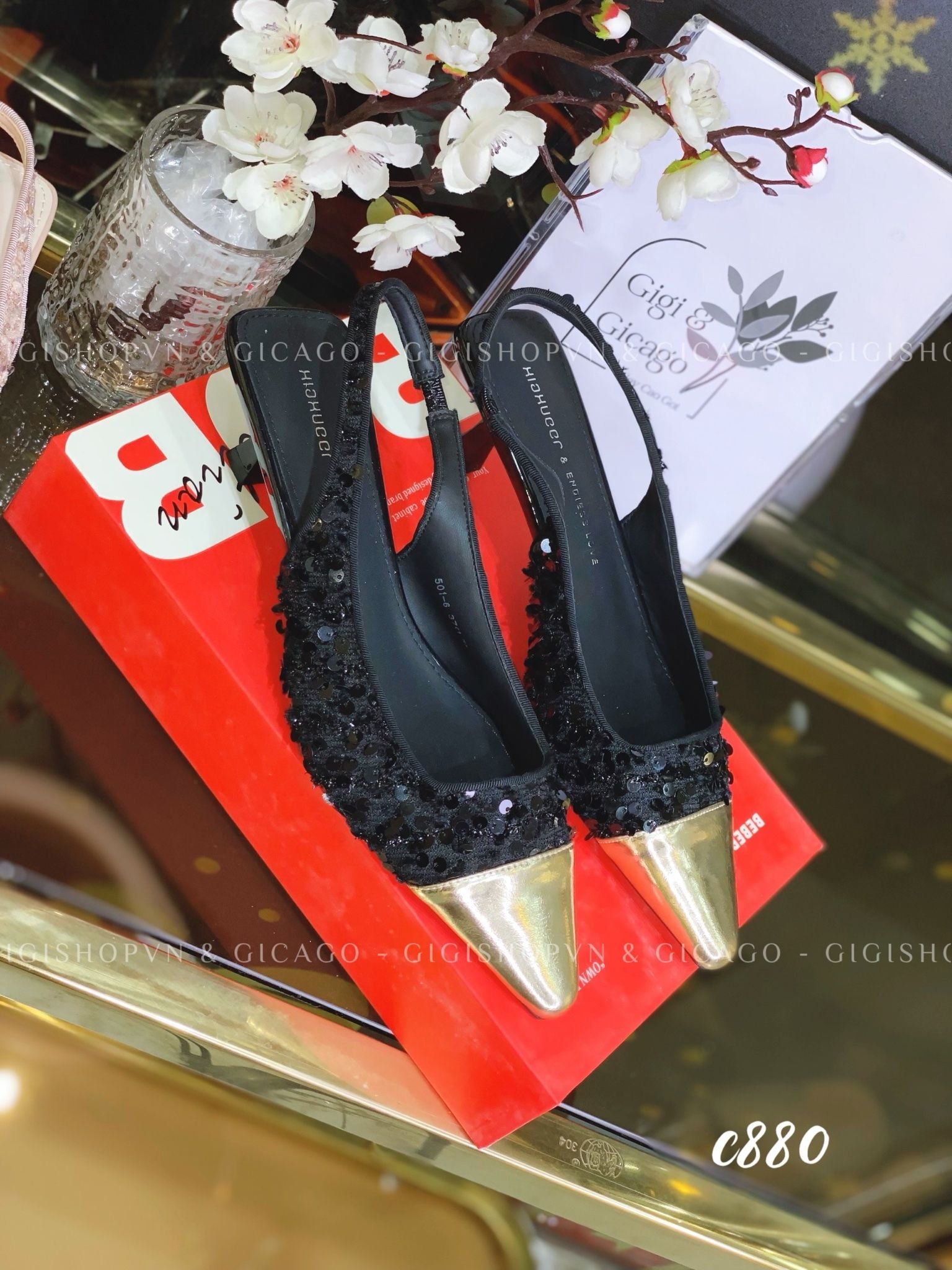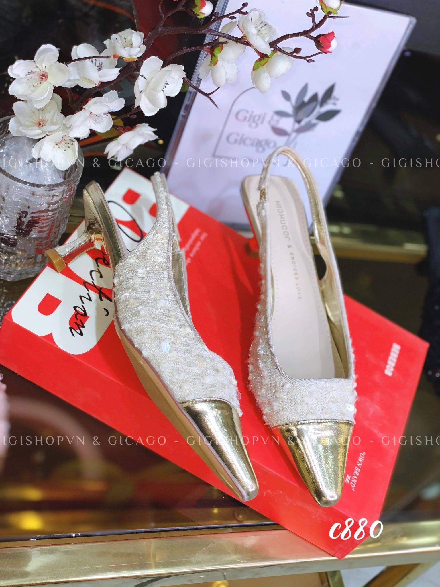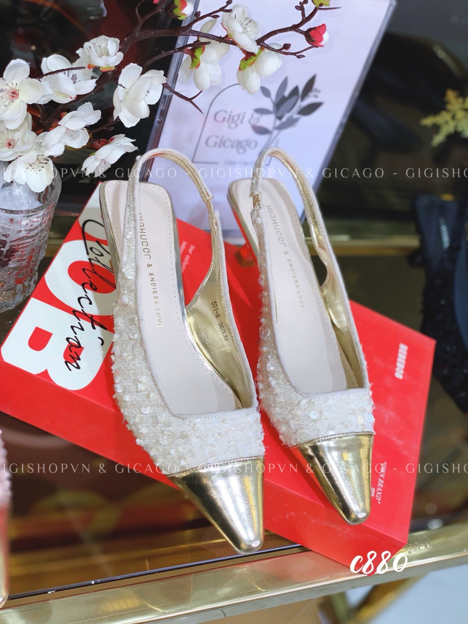 Giày cao gót hở gót tweed C880